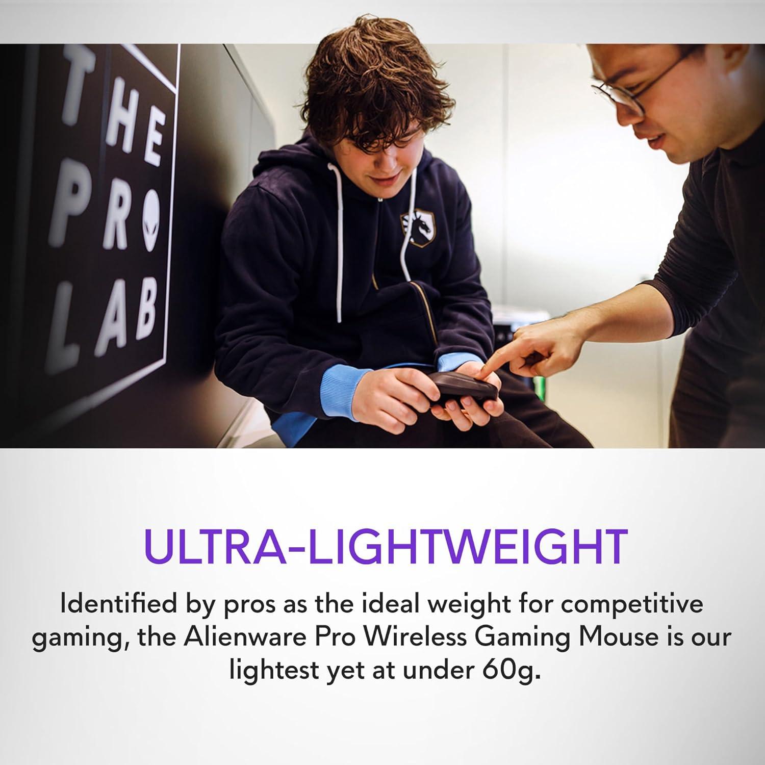 The Alienware Pro Wireless Gaming Mouse is the outcome of integrating feedback from Team Liquid and over 100+ pro gamers through surveys, interviews and usability testing over the course of 18 months. All culminating in a better-balanced center of mass and gliding, an improved magnetic clicker debounce, integrated dongle housing for portability, and long-term protective coating on the mouse body and scroll wheel for a consistent feel across the lifespan of the product.